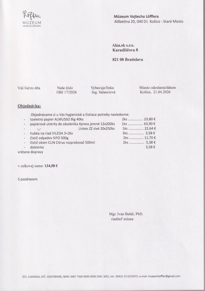 | 132024 | 5.6.2024 | Hygienické a kanc. potreby | Alza.sk s. r. o. | 6.6.2024 | |